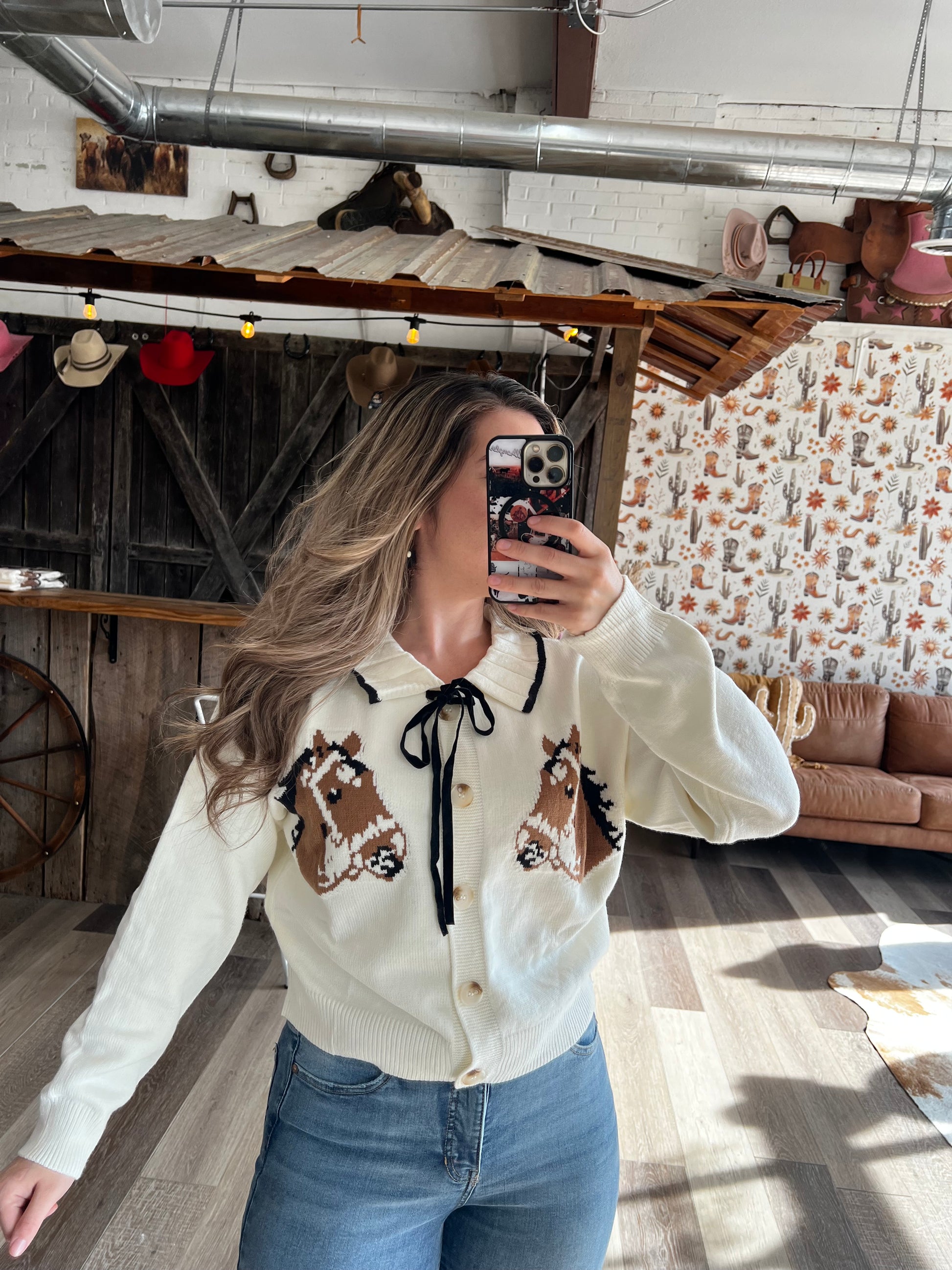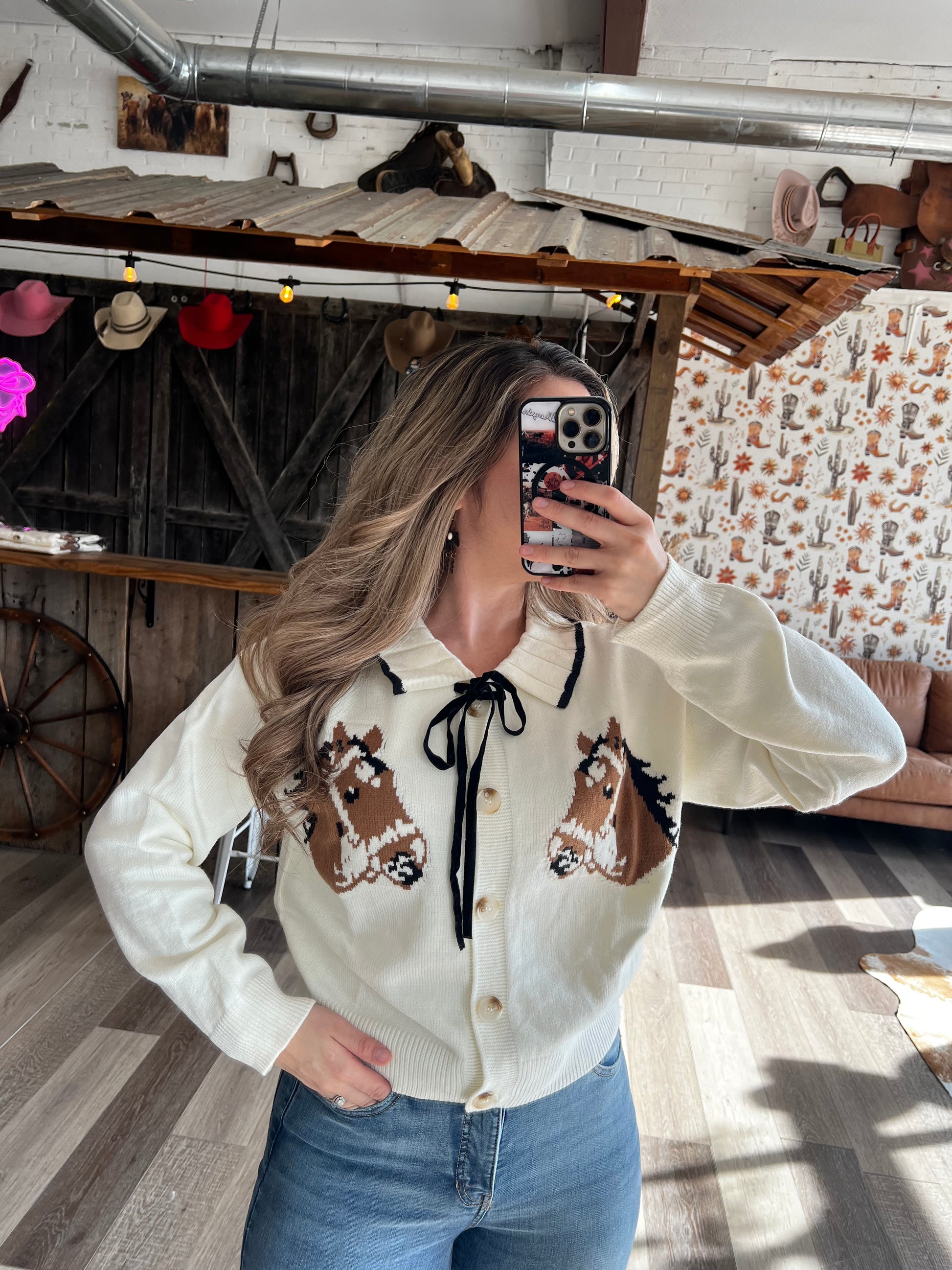 This knit cardigan features a cream base with matching horse graphics on the front panels. It includes a button-down front, ribbed cuffs and hem, and a soft fold-over collar with subtle contrast trim.